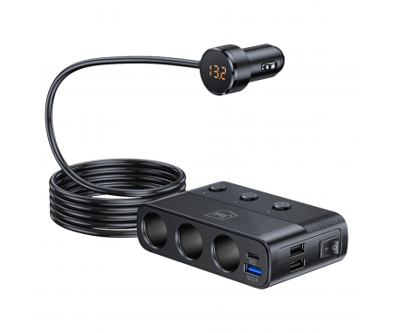 3MK szivargyújtós, autós töltő 120W, 3A, 3x USB A, 1x USB C + USB C, 3db szivargyújtó bemenettel, fekete